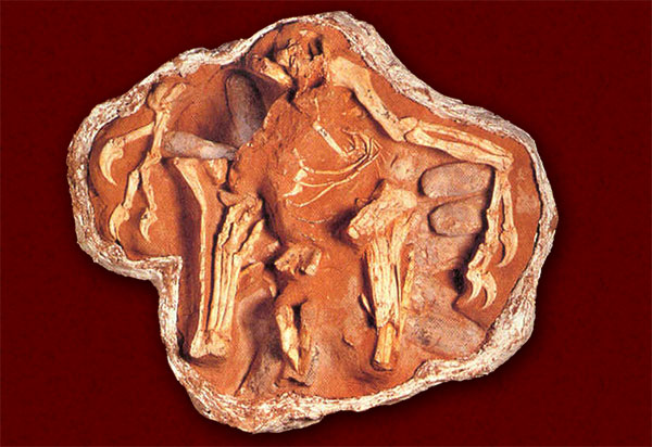 This 80 million-year-old fossilized Oviraptor nest proved to be an amazing discovery. The mother Oviraptor had died with her arms spread over her eggs, as if protecting them. This suggests that Oviraptor, and probably other bird-like dinosaurs, were brooders � they sat on their nests to keep the eggs warm or cool.