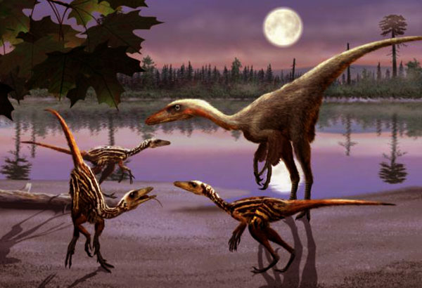 Dinosaurs did not give birth to live young in the way that mammals do. Like most reptiles, and like birds, female dinosaurs laid a number of eggs. These eggs were usually deposited in a nest made of the twigs and leaves, or in a hole that the female had dug in the soil or sand. Dinosaur eggs could be oval or round and as small as a tennis ball or as large as a cannonball. A baby dinosaur, such as this Troodon, may have pecked its way out of its protective shell with a specially designed egg tooth, just as baby birds do.