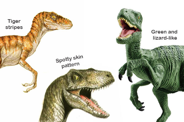Nobody can know for sure whether dinosaurs were plain or patterned, because colour fades away quickly and skin decomposes soon after death. However, it is highly likely that many dinosaurs would have skin colours and patterns that helped them to merge with their environment. A dinosaur living in scrubland, such as Velociraptor, may have been any one of variety of colours.