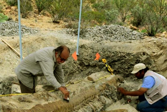 Palaeontologists are those scientists who study fossils. They work both at the world’s fossil sites, excavating fossils, and in the laboratory, cleaning and analyzing fossils. Here, a palaeontologist treats a sauropod bone before moving it from the Sahara desert. Dinosaur bones are easily uncovered in the desert sands without the need to dig deep.