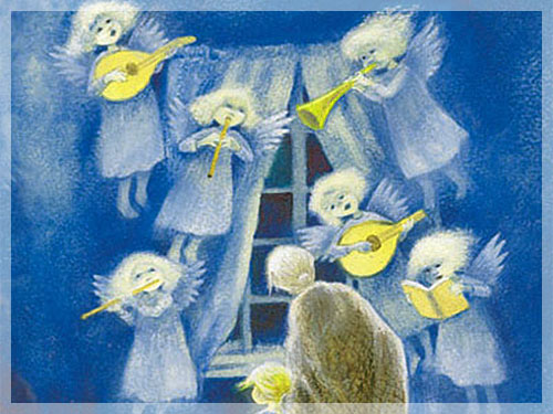 He saw that all around him stood a ring of little silver-winged angels, and each held a stringed instrument, and all sang in loud tones that tonight the Saviour was born who should redeem the world from its sins.