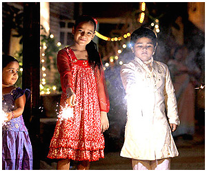 Inside most Hindu homes, idols of Goddess Lakshmi and Lord Ganesha are worshipped during the day. However, the true jubilations begin at dusk. The night is transformed by a beautiful spectacle of light as tiny earthen lamps (diyas) and candles are arranged in rows around homes. People wear new clothes, light firecrackers, and burst sparklers. The celebrations extend beyond the home, as families visit friends and relatives to exchange gifts and wish them a happy Diwali.