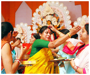 Since this is the last day of the goddess in her paternal house hence many arrangements are prepared to pamper the Goddess. It is a common Hindu belief that Devi will go back to Kailasa after Maha Nabami and she will again come back after one long year. Thus it is the day when almost every Bengali feel depressed and dejected for they are about to depart from the Goddess. It is thus almost a customary affair for the Bengali mothers present to treat Goddess Durga as their own daughters and thus pamper accordingly. Thus they feel the pain which is of same kind when their own daughter departs from her just to go to the return to her in-laws house.