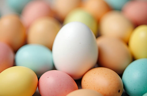- Gather several colored, hard-boiled eggs and one plain white, hard-boiled egg.