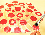 Use the Shape-cutter and the Circles-1 template to cut out the following shapes from the water-melon paper. Cut out thirteen 2" (5cm) circles. Cut out eleven 1" (3cm) circles, spacing them at least 3" (8cm) apart n the large sheet of paper. Cut out six donut shapes by placing the 2" (5cm) template over the top of a 1" (3cm) hole that was left in the large sheet of paper.