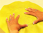 Brush more laminate over the back of the paper to keep it pliable. Use your fingers to mold the paper into the scalloped areas of the plate. Don't worry if you have a few wrinkles in the paper. Smooth them the best you can and the remaining wrinkles are called "handmade nuances," and will barely be seen on the front of the plate.