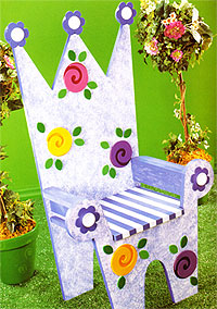 With its bold colors and striking presence, this fantastic throne can be a great showpiece in any child's room. The wooden glue-ons used in this particular project follow a floral theme, but you could draw from other decorative elements in the room to suit the royal fancy of your own prince or princess.