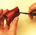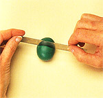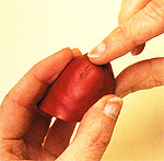 Form a 1½" (4cm) ball of scrap clay and roll it between your hands to make an oval about 1¼" (3cm) diameter and 2" (5cm) long. Bake the oval for 30 minutes. Allow it to cool until you can handle it but it is still warm. With a sharp blade, cut neatly through the "equator" of the oval to give two identical formers. (Clay is much easier to cut when it is still warm.)