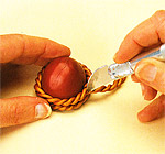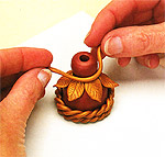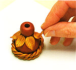 Form a thin log of gold clay, about 1/16" (1.5mm) thick, and warp this around the tassel between the leaves and the ball finial. Repeat steps 8 to 15 for the second cup.