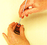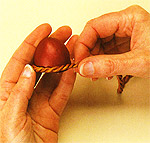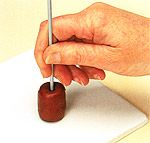 Use the knitting needle to pierce a hole right through the ball and the clay sheet covering of the former. Rotate the needle to enlarge the hole, which needs to be 3/16" (5mm) wide, or at least wide enough for your chosen cord to pass through.