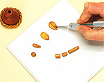 Form a ¼" (6mm) thick log of gold clay and cut six ¼" (6mm) lengths. Roll these into balls and shape each into a teardrop. Press each teardrop down onto a tile so that it thins and forms a leaf shape. Use your knife to mark veins.