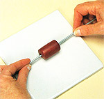 With the bead still on the knitting needle, hold a paintbrush handle across the bead and, pressing down lightly, roll the bead back and forth on the tile so that the handle "grooves" the clay. Repeat to make five evenly spaced grooves.