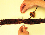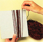 Cut a piece of stiff card into a 6" (15cm) square. Wind the yarn around this until you have a good thick hank for the tassel skirt.