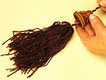 Hold the tassel by the cord and pull the yarn down over and around the knot. Arrange the yarn so that the cord emerges from the center of the3 gathered yarn. Pull the other end of the cord to draw the tassel into the tassel cup.