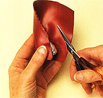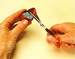 Trim away the excess clay around the base of the former with scissors and neaten the bottom edge. Take care that the clay does not curve around onto the bottom of the former, or the tassel cup will be difficult to remove from the former after backing. Repeat steps 4 to 7 to cover the second former.