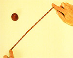 Cut a length of cord that is long enough to go round your curtain twice and add an extra 18" (45cm). If the cord starts to fray, glue the ends together with a little tacky glue. Bend a paperclip into a hook and use this to pull one end of the cord through one of the tassel cups.