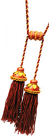 Thread the second end of the cord through the tube bead and then through the second tassel cup. Attach the second tassel skirt in the same way as the first. Lay the tassels out in front of you and push the paperclip hook through the tube bead. Catch a loop of cord from about halfway along and pull it through the tube bead. This almost magically gives you the two loops for the tieback and leaves the two tassels dangling by their cords.