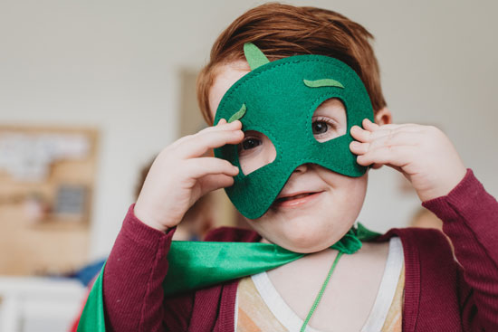 Turn your child into a walking, talking pinata. Use a cardboard box and cut out holes for arms, legs, and head. Cover the box with colorful tissue paper fringe. Add a party hat and a bag of candy for an adorable touch.