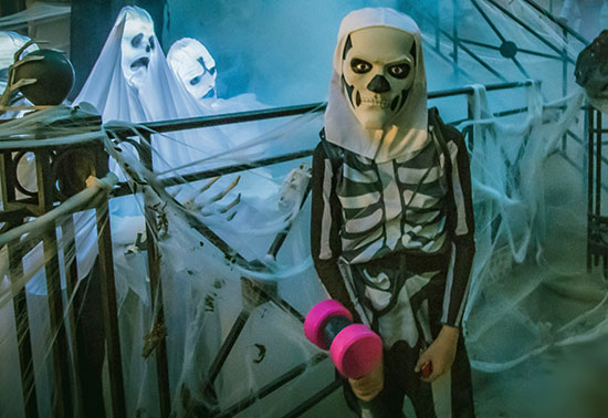 A terrific Halloween smash. Black leotard and tights once more. Use white tape or chalk for ribs and bones. Apply white makeup on face with black eyes.