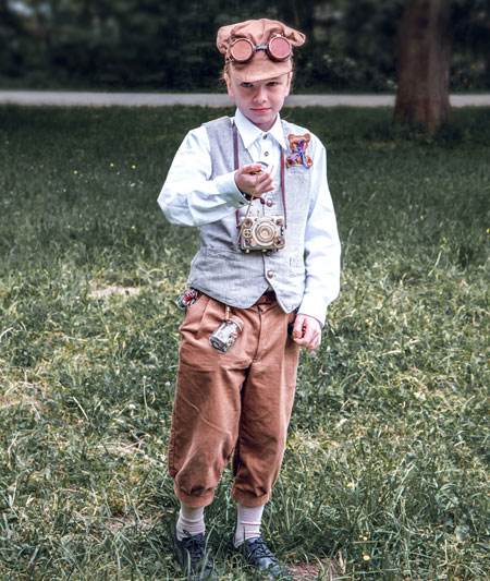 Create a steampunk-inspired aviator look. Dress your child in a brown leather jacket, aviator goggles, and a pilot's cap. Accessorize with gear and cog details, and add some temporary tattoos to resemble aviation-inspired tattoos.