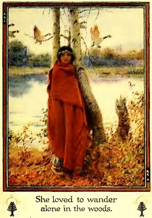 There remained the youngest daughter, Oweenee - the fairest of them all. Gentle as she was beautiful, none was so kind of heart. Unlike her proud and talkative elder sisters, Oweenee was shy and modest, and spoke but little. She loved to wander alone in the woods, with no company but the birds and squirrels and her own thoughts. What these thoughts were we can only guess; from her dreamy eyes and sweet expression, one could but suppose that nothing selfish or mean or hateful ever came into her mind. Yet Oweenee, modest though she was, had a spirit of her own. More than one suitor had found this out. More than one conceited young man, confident that he could win her, went away crestfallen when Oweenee began to laugh at him.