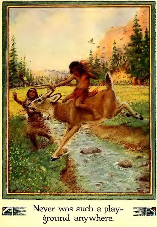 This valley was a lovely place to live in; never was such a playground anywhere on earth. It was like a great green carpet stretching for miles and miles, and when the wind blew upon the long grass it was like looking at the waves of the sea. Flowers of all colors bloomed in the beautiful valley, berries grew thick on the bushes, and birds filled the summer air with their songs.