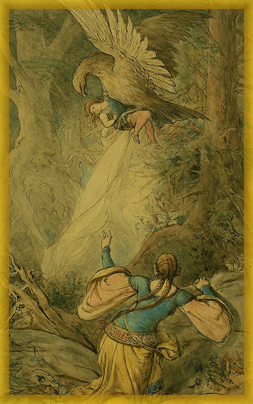 There was once a forester who went into the forest to hunt, and as he entered it he heard a sound of screaming as if a little child were there. He followed the sound, and at last came to a high tree, and at the top of this a little child was sitting, for the mother had fallen asleep under the tree with the child, and a bird of prey had seen it in her arms, had flown down, snatched it away, and set it on the high tree.