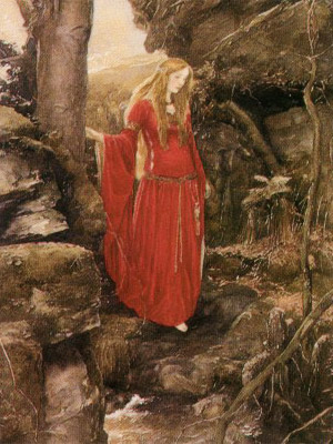 They entered the house, and after meat she told them that the maiden Olwen came there every Saturday to wash. They pledged their faith that they would not harm her, and a message was sent to her. So Olwen came, clothed in a robe of flame-coloured silk, and with a collar of ruddy gold, in which were emeralds and rubies, about her neck. More golden was her hair than the flower of the broom, and her skin was whiter than the foam of the wave, and fairer were her hands and her fingers than the blossoms of the wood anemone amidst the spray of the meadow fountain. Brighter were her glances than those of a falcon; her bosom was more snowy than the breast of the white swan, her cheek redder than the reddest roses. Whoso beheld was filled with her love. Four white trefoils sprang up wherever she trod, and therefore was she called Olwen.
