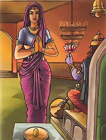 Born Godai (meaning "garland weaver") in Tamil Nadu, Andal was adopted by the ardent Vishnu devotee, Perialvar. Growing up amidst the chanting of hymns and the fragrance of temple flowers, Andal's life became an offering to the divine.