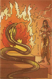 and fell into the fire together. When Indra saw that Takshaka was bound to