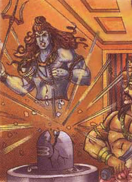 and struck the Shivalinga with a sword. Out came Shiva himself and burnt