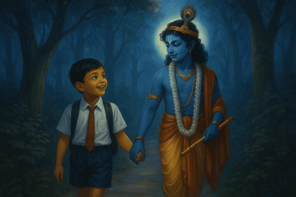 Shyam, a little boy living with his widowed mother near a dense forest, was afraid of his long walk to school. But when his mother speaks of a brother named Gopal who would walk with him, Shyam gains courage. This heartwarming tale reveals the divine presence of Lord Krishna in the form of Gopal - a magical brother who guides and protects the child through his journey.