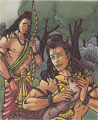 Meanwhile, Rama and Lakshmana, upon realizing Maricha's deception, rush back to their dwelling, a sense of dread gripping their hearts. The sight that greets them is unsettling – the door ajar, scattered fruits, and a deafening silence where Sita's laughter once resonated. Their frantic search leads them deeper into the forest, hope diminishing with each passing moment.