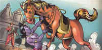 With perfect timing, Krishna caught hold of Kesi's front legs and spun him around like a toy. Then, with a loud thud, he flung the demon horse to the ground. Kesi hit the earth so hard that the dust rose like a cloud. For a moment, it looked like the demon was knocked out cold.