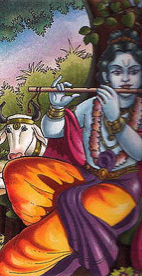 Krishna and his brother Balarama used to take their family's cows out to graze near Gokul. While the cows fed peacefully, Krishna would charm everyone with sweet flute tunes and playful games with his friends.