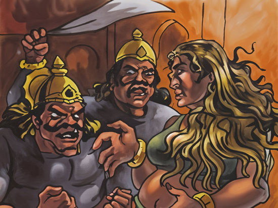 One day, Surpanakha, the sister of the demon king Ravana, encountered Rama and Lakshmana in the forest. Enamored by Rama's beauty, she approached him, but Rama politely declined her advances, stating his devotion to Sita. Surpanakha then turned her attention to Lakshmana, who also rejected her. Humiliated and enraged, Surpanakha attacked Sita, prompting Lakshmana to intervene. In a fit of anger, Lakshmana cut off Surpanakha's nose and ears, disfiguring her.