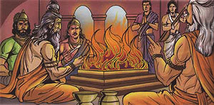 Vyasa to guide him. Vyasa sent the rest of the Pandavas in different direction to conquer the kingdoms that were ruled by the Pandavas' enemies. They came back after bravely defeating their enemies and brought a lot of wealth that could be used for the yajna. Yudhisthira invited many guests including sages and kings. Krishna also graced the occasion with his presence. Sage Dhaumya was made the royal priest for the Yajna. Yudhisthira performed all the rituals. Offerings were made to the gods. Brahmins were given gifts and the yajna was completed successfully. All the elders blessed Yudhisthira and he became the samrata.