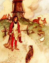 There was a miller who had three sons, and when he died he divided what he possessed among them in the following manner: He gave his mill to the eldest, his ass to the second, and his cat to the youngest. Each of the brothers accordingly took what belonged to him, without the help of an attorney, who would soon have brought their little fortune to nothing, in law expenses. The poor young fellow who had nothing but the cat, complained that he was hardly used: "My brothers," said he, "by joining their stocks together, may do well in the world, but for me, when I have eaten my cat, and made a fur cap of his skin, I may soon die of hunger!" The cat, who all this time sat listening just inside the door of a cupboard, now ventured to come out and addressed him as follows: "Do not thus afflict yourself, my good master. You have only to give me a bag, and get a pair of boots made for me, so that I may scamper through the dirt and the brambles, and you shall see that you are not so ill provided for as you imagine." Though the cat's master did not much depend upon these promises, yet, as he had often observed the cunning tricks puss used to catch the rats and mice, such as hanging upon his hind legs, and hiding in the meal to make believe that he was dead, he did not entirely despair of his being of some use to him in his unhappy condition.