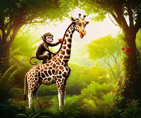 One day he said to the giraffe, "There's some lovely juicy fruit growing on that tree, but you wouldn't be able to reach it" The giraffe said, "lt is impossible. Just watch me." Then the giraffe reared up its long neck, and put out the tongue, but the fruit was just out of reach. "I said you couldn't reach it," said the monkey. "But I can." Suddenly, the monkey jumped on to the giraffe's back and scrambled up his neck. Then he stretched out his long arm and picked the fruit. The monkey said, "We could not do it alone, but we can do it together." And after that, the tallest giraffe didn't boast any more, and it became best friend of monkey.