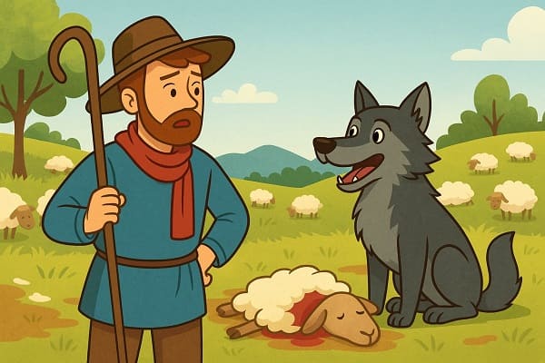 One day, he was called at home. The shepherd thought that his sheeps would be safe with the wolf. He called the wolf and let it live in his farm and he went home.After a few days the shepherd returned back. On reaching his home he saw that the wolf had eaten up most of his sheeps. Only a few sheep were left. He took a stick and made the wolf exit from his farm. The shepherd sat in the corner and said, "lt was my fault. I am a foolish man. I trusted the my sheep." He went inside his house and cried. Now he could not get his sheeps back again.