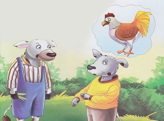 Once upon a time there lived two calves and a chicken in a house. The owner of the house treated the chicken well and gave him best food to eat. The two calves were made to work hard in the fields the whole day and they were given grass and hay to eat. The younger calf said, "Why should the chicken get all the comforts when we work hard the whole day?"