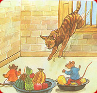 their hole to save themselves, so the cat ate up all the cheese and fruit.