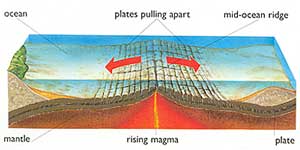 Right down the middle of the sea bed in the Atlantic Ocean, there is a giant crack where the tectonic plates are pulling apart. Molten (melted) rock from the Earth's interior wells up into the crack. As it cools, it solidifies (becomes solid) to form the mid-ocean ridge.