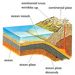 In many places, tectonic plates slowly crunch together with enormous force. As they collide, one plate may be forced under the other. Earthquakes and volcanoes are often the result.