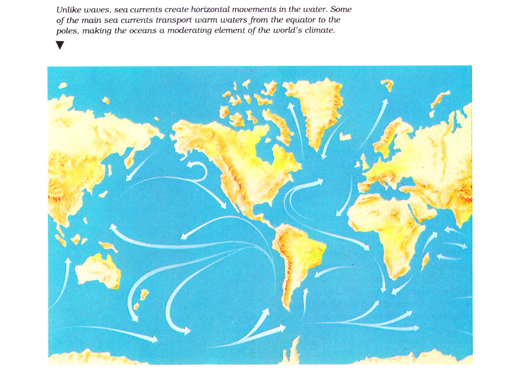 Unlike waves, sea currents create horizontal movements in the water. Some of the main sea currents transport warm waters from the euqator to the poles, making ht oceans a moderating elements of the world's climate.