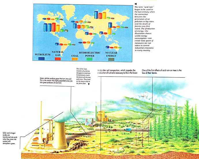 Acid rains transmit its acidity to rivers, ocean, and lakes, to villages and cities, to fields and forest. Such acidity impoverishes the nutritional capacity of the soil as it alters the population of the microorganisms. Forest is subjected to the effects of the acidity as well, because the rain and low clouds contains acid particles.