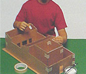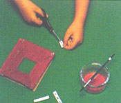 Two sheets of card, pencil, ruler, scissors, self-hardening clay, cutting board, rolling pin, modeling tool, sandpaper, acrylic paint (blue, gold, green, yellow ocher), paintbrush, water pot.