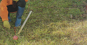 1. Choose a patch of ground to sample and put in a peg. Measure 1 yard with the ruler, and put in another peg. Stretch and tie a piece of string between the pegs.