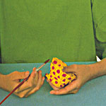 Allow the pot to dry for about 12 hours on each side before painting it yellow with red spots. To finish, apply a varnish made of 8 parts PVA glue and 1 part water.