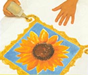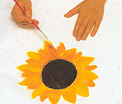 Paint the centre of the sunflower with black fabric paint. Use shades of yellow, red and orange to paint the petals. Allow the paint to dry.